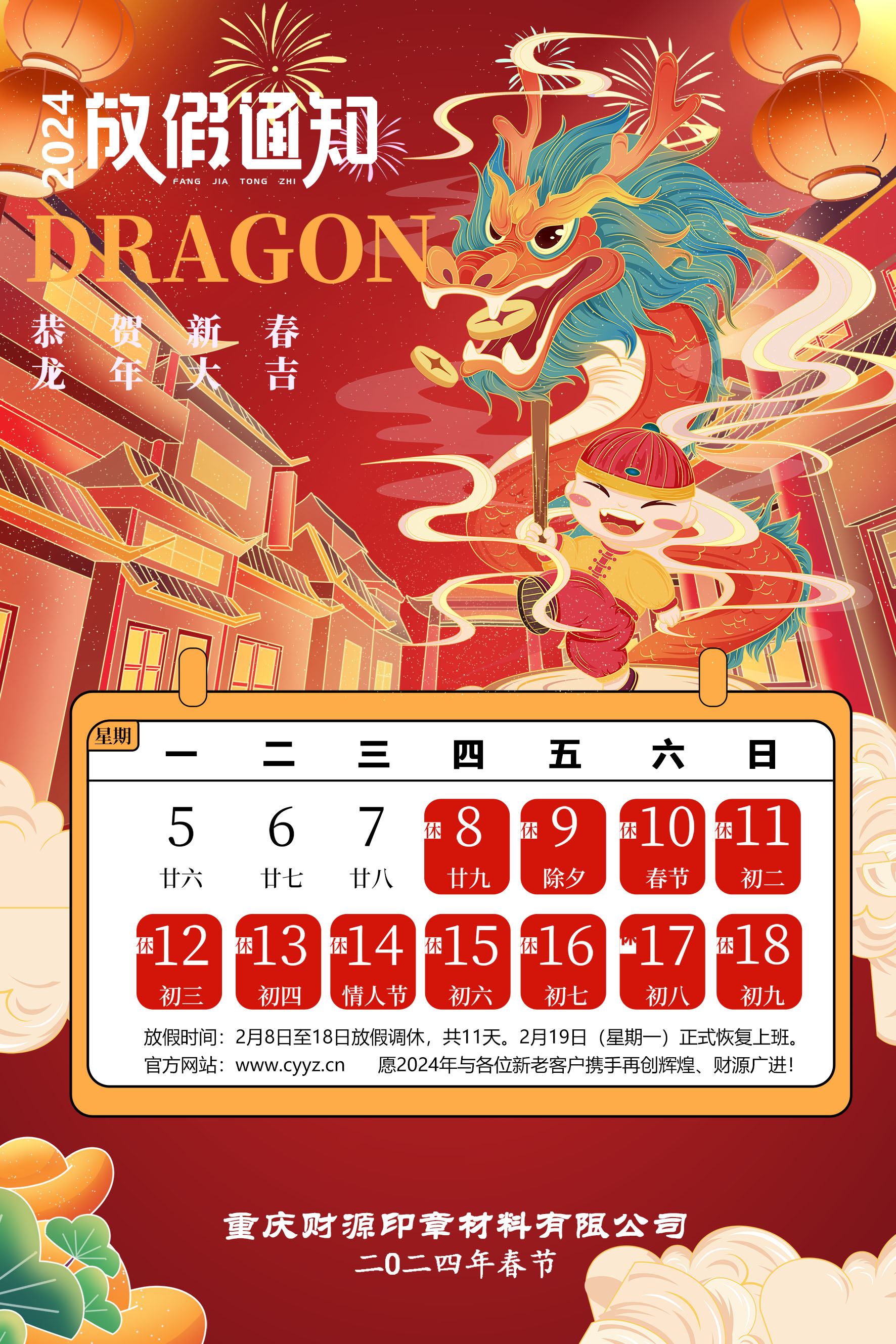 根据国务院办公厅放假通知,结合本单位实际情况,现对2024年春节假期安排如下:2024.2.8-2.18,共11天,2月19日(正月初十,星期一)正式上班。由此带来的不便,敬请理解,并请提前安排好相关工作,以免误事。祝大家新春快乐、吉祥如意、生意兴隆、财源广进!